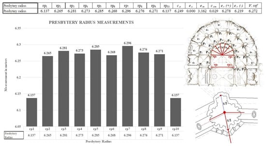 To determine the measurement of the nine radial chapels (c1…c9) and reviewing the auxiliary lines of Guarc’s parchment (T6.2) and (T6.3), the most probable value is (ca(c1–9) = 5538 m). The root mean square error is ec = 0.090 m, resulting in a relative error (er(c1–9)) with a range of 5.613–5.463 m. Similar results are obtained with the seven radial chapels (c2–c8), where the reference values yield a range of 5.645–5.483 m, close to 24 spans (5.575 m), which are three canas (Figure 11). The centers of the presbytery pillars (P11–P20) and the 10 radii (rp1–rp10) are situated at a most probable distance of ca = 6249 m, with a relative value between the range of 6.278–6.219 m and within the measurement of 6.272 m; they have 27 spans, which is half of the 54 spans of the radius where the radial chapels are traced (Figure 12). The centers of the pillars P12 y P19, homologous to the new designs of (P11–P12) and (P19–P20), with displacements P11 and P12, are 0.107 m and between P19 and P20 (0.168 m).