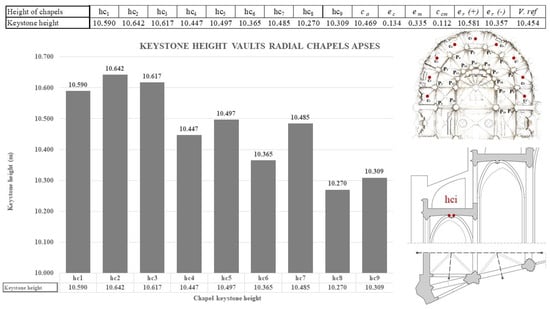 To determine the measurement of the height of the nine radial chapels (c1…c9), the zenith of the ribbed vault of the radial chapels (c1–c9) is taken as a reference, and it is located at the neck of the keystone, with the most probable value of the chapels (hca(c1–9) = 10,469 m) obtaining a relative error (er(c1–9)) in the range of 10.581–10.357 m. The range of the statistical result falls within the metrological measurement of 45 spans (Figure 13) (Appendix A, Table A1 and Table A2).