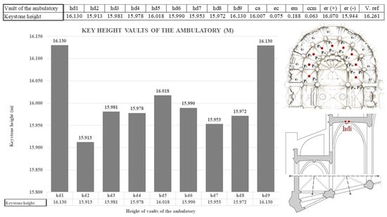 The height of the nine vaults of the ambulatory (hd1…hd9) has a most probable value (hda(c1–9) = 16.007 m). The relative error (er(c1–9)) ranges from 16.070 to 15.940 m within the range of 69 spans, and it is close to 70 spans, which is within the methodological error (Figure 14). The section of the presbytery vault does not have a direct measurement since the presbytery keystone casts a shadow over the neck of the constructive element. Taking references from the points (TLS), knowing point A (22.908 m), and given that the arch has a quarter section, we can deduce, by extending said arch, the keystone center, which would be situated at a height of 23.237 m above the presbytery floor. Taking a metrological value of 100 spans (23.230 m), a value similar to the indirect result determined by (TLS) is obtained, and it is where the keystone with the Coronation of the Virgin is located (Figure 15).