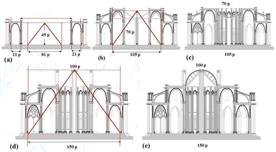 Section displays of the apse of the Tortosa Cathedral (1346–1441). Construction and proportional evolution of the apse; (a) radial chapels; (b,c) ambulatory; (d,e) placement of the keystone of the chancel.