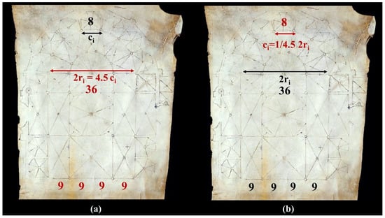We know the methodology of constructing the heptagon through the Geometria Deutsch (1472), attributed to Hans Hösch von Gmünd (fl. 1472) (Heideloff 1844, pp. 96–97), and the Geometria Deutsch (1488) by Matthäus Roriczer (+c. 1495) (Roritzer 1999, pp. 56–60). In these works, the side of the heptagon is determined as the height of an equilateral triangle with a side equal to the radius of the circumference. This method has come down to us through Underweysung der Messung (1525) by Albrecht Dürer (1471–1528), a consequence of the corollary of the construction of the pentagon (LII.15) with a value of √3/2 (Dürer 1525, 26r–27v). The origin of this method can be traced back to the Kitāb fī mā yaḥtāju al-ṣāni‘ min al-a‘māl al-handasiyya (c. 993–1008) (Book on those geometric constructions which are necessary for craftsmen) by Mohammad Abu’l-Wafa Al-Buzjani (940–998), and its reception in Latin Europe occurred through Ibn Yunus, Kamal al-Din (1156–1242) in the court of Emperor Frederick II (1194–1250) (Raynaud 2012, pp. 34–83). Guarc’s method determines the diameter of the circumference through the side of the regular polygon and its ratio (18:8), unlike Euclid’s “Elements,” Book IV, where the side is a consequence of the inscribed circumference (Heath 1908, pp. 88–111). Knowing the measurement of the chapel (ci) results in the determination of the ambulatory (4,5 ci) (Figure 18a), or vice versa is also possible given the width (2 ri) and the radial chapel (1/4,5 2ri) (Figure 18b).