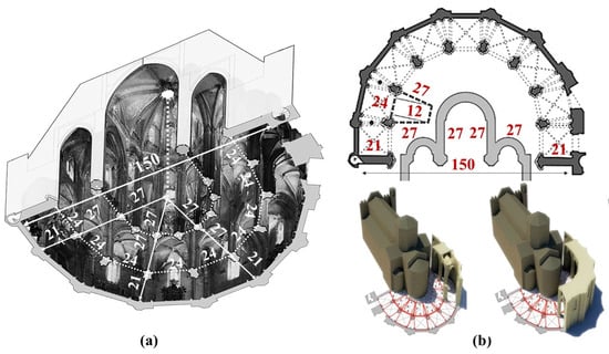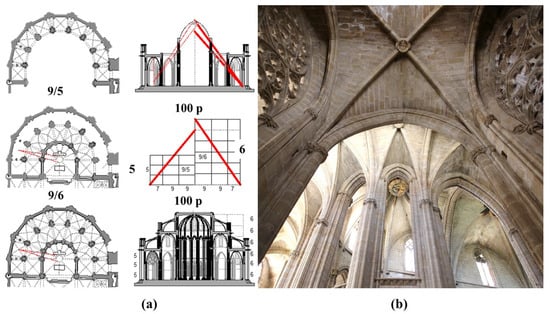 The layout of the apse of the Tortosa Cathedral (1346–1441). (a) Metrological construction of the apse of 150 spans with a radial chapel of 24 spans; (b) Polygonal layout of the ambulatory without the need to determine the center of the apse.