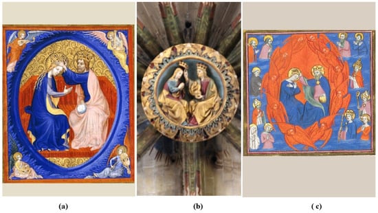 The Coronation of the Virgin concludes with the episodes of her Dormition and her Assumption into heaven, which are frequent themes in iconography attributed to Melito of Sardis (+c. 180)31. It was popularized in the passage Summa aurea (1261–1266) by Jacobus de Voragine (ca. 1229–1298), Assumptio Beatae Mariae Virginis Cap. CXIX, which states, “Come from Lebanon, you who are to be crowned.” (Voragine 1999, pp. 479–83), and this was referred to in the 1420 cathedral’s inventory: Item, liber vocatus Flos sanctorum, in pergameno, in latino, qui fuit honorabilis domini decani Dominici Meseguer [38]; Item, Summa Aurea, in pergameno, cum littera minuta, spessa, cum cohopertis virmilis [40]; and Item, quidam liber vocatus Flos sanctorum [48] (Baiges 1999, pp. 3–20). The image of the cathedral (Figure 21b) is consistent with the illumination of the Horae ad usum parisiensem (1375–1425) (BnP, NAL 3093-2, fol. 75v) (Figure 21a).