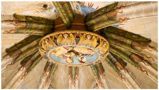 The ten angels surrounding the coronation appear in De Civitate Dei (BnF, Franc. 24 fol. 262v) (15th century) (Figure 21c), accompanied by bishops, the Pope, and the Saints. The keystone of the presbytery is protected by eleven winged dragons arranged on the crossing arches converging at the main keystone. The meaning of the dragon, symbolizing the combat to be overcome by Virtue, is that it is a protective element of the temple and the faithful who seek refuge in it (Figure 22).
