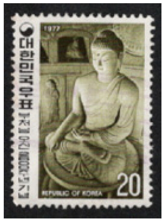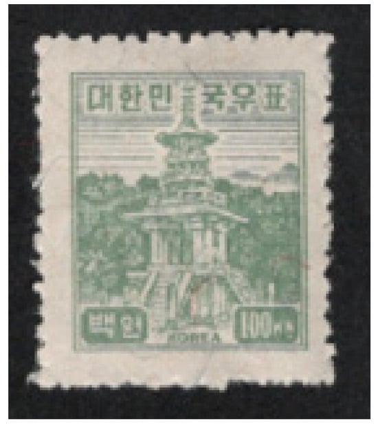 Under the category of ‘cultural history’, design elements in the stamp’s icon include such motifs as temples, shrines, paintings, ceremonial objects, dancers, drummers, and other aspects of material culture or practised religion. Examination of these images showed that the objects or subjects portrayed were perceived to be either historic or ‘traditional’ and had been selected to show either the historic depth of national culture or its sophistication. For example, the highest-value stamp (KRW 100) in the first definitive series of ROK stamps issued in 1949 shows an image of the Tabo-t’ap (多寶塔) pagoda (SK 54, Figure 1), which is part of the Pulguk-sa (佛國寺) temple complex dating to the mid-eighth century. In this series, there are depictions of another historic but non-religious building and scenes of industry and agriculture. As a definitive stamp, SK 54 would have been seen much more frequently than any commemorative issue. This use of Buddhist cultural imagery on stamps has continued down into the present. On 22 February 2023, the ROK issued a set of three commemorative stamps depicting repatriated Buddhist objects—a temple bell (SK 3632), a Buddhist scriptural text (SK 3633), and a portable Buddhist shrine (SK 3634). These objects had all been taken as booty during the incursions of French troops in the 1870s (Kim 2012, pp. 281–83) and were being returned to Korea. On 14 April 2023, South Korea issued a set of four stamps depicting four different temples (SK 3668–3671). Overall, Buddhist images constituted 45 percent of all religious images on stamps in the cultural history category, amounting to 73 stamps in total. Of these 73 stamps, one-quarter of the issues were definitive stamps. The images on the definitive stamps would have been seen repeatedly, unlike images on individual commemorative stamps, which would have had a more limited circulation.