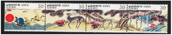 The next largest category of images in the subject area of cultural history was the ‘religious‘ aspects of folklore, accounting for 66 images or 41 percent. Again the use of imagery of this type appears very early. On 1 April 1951, less than three years after the founding of the state and during the middle of the Korean War (1950–1953), South Korea issued a definitive series of stamps that included issues depicting two folkloric animals, the irwŏl-hak (日月鶴, Sun-Moon Crane) and the Paekho (白虎, White Tiger), SK 72 and SK 73 (Figure 2 and Figure 3). Subsequent issues had images depicting spirits on the ends of roof tiles, folkloric animals in paintings or adorning objects, such as poles, as well as performance images, such as shamanic dancers and shamanic ceremonies in modern art. A repeating folkloric image is of the Sip changsaeng (十長生, Ten Symbols of Longevity; Pratt and Rutt 1999, p. 273). Although these ten symbols are common to all of the nations of East Asia, the Korean tradition has been to place them all together within a single work of art, often as the scene on a multi-panel screen. In 1980, the ROK issued four stamps (SK 1213-1216, Figure 4) on this theme, which was repeated again in 1989 (SK 1585) for World Environment Day and again on 16 August 1994 in a set of eight stamps for the world stamp exhibition PhilaKorea 1994 (SK 1791–1797). The date of issue is significant, as August 15 is the date in 1945 when Japan surrendered to the Allied forces. The date is celebrated each year as national Liberation Day (Haebang-ŭi nal, 解放 의 날) and often has had a commemorative stamp issued on or around that date. The most recent issue on the Sip changsaeng motif was a minisheet from 30 March 2023 (SK 3639–3654).