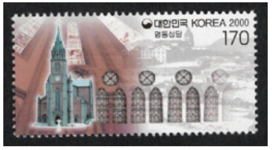 The fourth theme represented in stamps in the category of ‘cultural history’ is Christianity. There are five stamps issued in the past seventy-five years that use this theme, the same number of stamps issued with a Confucian theme. However, there are no definitive stamps with this theme. Christian-themed stamps are all commemorative stamps. Christian images only appear in the later part of our period, the first (SK 2118, Figure 7) being issued on 1 November, 2000 as part of the Millenium Series. It depicts the Catholic cathedral of Sŏul. Nearly a quarter century later in 2022, a set of four stamps was issued as part of the Historic Buildings Series, depicting both historic Catholic and Anglican churches (SK 3576–3579), two of which were early parish churches.4 These depict the Christian contribution to Korean culture as religious architecture only, and this recognition appears late in the period.