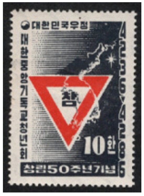 Over the seventy-five-year period of national independence, 29 of the 209 South Korean stamps that used religious themes to promote, celebrate, or commemorate some aspect of religion used Christian themes and motifs. Christian-themed stamps were issued early (from 1953) to the last year of the period. The first commemorative stamp that was issued just after the Korean War in 1953 celebrated the fiftieth anniversary of the foundation of the Korean YMCA (SK 168, Figure 14). The YMCA and its affiliate organisations were celebrated throughout the period. In 1964, the fiftieth anniversary of the foundation of the association of local YMCAs was celebrated (SK 413); the seventy-fifth anniversary of the founding of the YMCA was commemorated in 1978 (SK 1130); the fifty-fifth anniversary of the Y’s Men’s Clubs and its world meeting in Sŏul was celebrated in 1982 (SK 1280), as was the World Assembly of the YMCA in Sŏul in 1991 (SK 1673); and the one-hundredth anniversary of the Korean YMCA was commemorated in 2003 (SK 2366). The equivalent woman’s group, the YWCA, was also celebrated on stamps in 1962 (fortieth anniversary, SK 341), in 1972 (fiftieth anniversary, SK 825), in 1982 (sixtieth anniversary, SK 1268), and in 2022 (centenary anniversary, SK 3564).