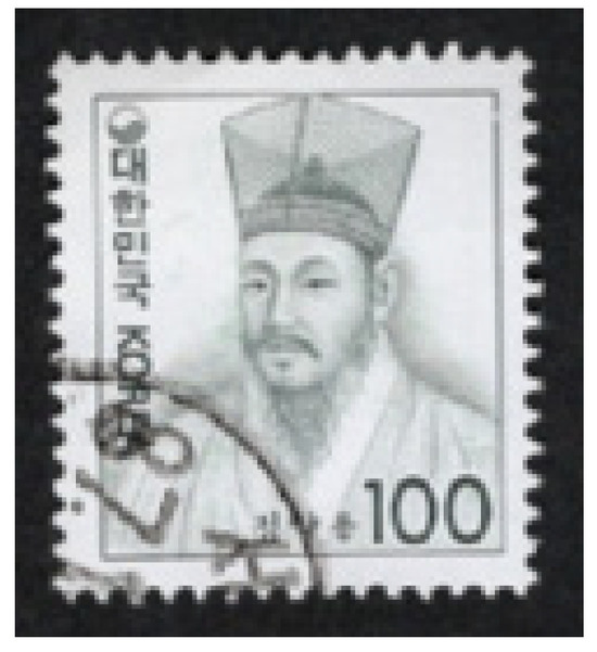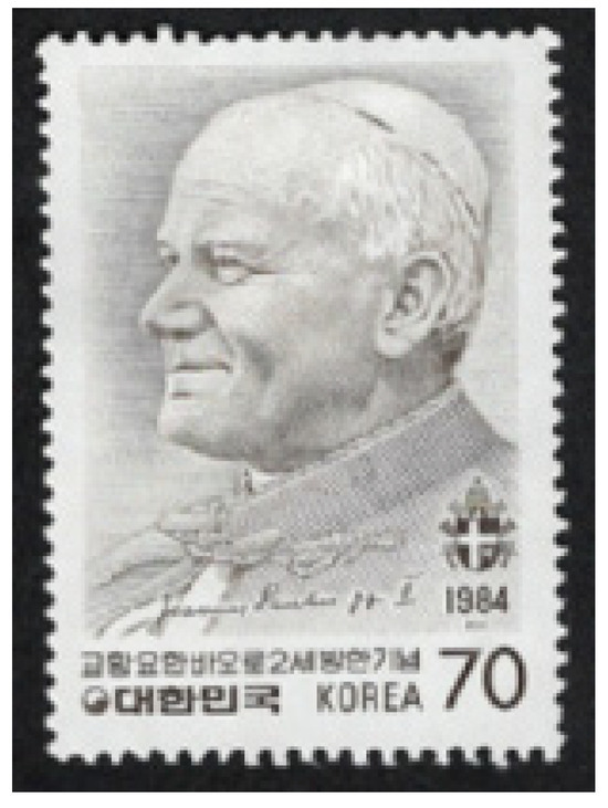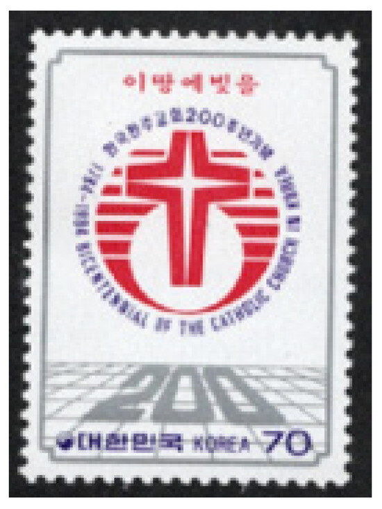 Individual Christians began to appear on commemorative stamps, as we have seen with two stamps for Pope John Paul II in 1984. In 1986, a definitive stamp featuring the key late Chosŏn scholar Chŏng Yagyong (丁若鏞, 1762–1836, SK 1475, Figure 18) was issued. Tasan (茶山), as he was known by his literary name, is an ambivalent figure, who at an early stage had been a Catholic (as were many of his own relatives) and then under pressure said that he rejected Catholicism. Some argue that he remained a secret Catholic (Cawley 2019, pp. 104–5). Whatever the situation may actually be, it is significant that he, as someone who at least at some point in his life had been a Christian, is not only remembered but is remembered on a definitive stamp, not a commemorative stamp. The eminent Cardinal Archbishop of Sŏul, Kim Suhwan (金壽煥, 1922–2009), is commemorated on a stamp from 2016 (SK 3126) in the same series as the leading Buddhist monk Sŏngch’ŏl. In 2021, the two-hundredth anniversary of the birth of Kim Taegŏn (金大建, 1821–1846), the first Korean to be ordained as a Catholic priest and a martyr, was celebrated on a stamp (SK 2535). Three other Christians were remembered on South Korean stamps. In 2022, Gregor Mendel (1822–1884, SK 3602), a Catholic priest and scientist, and Homer Hulbert (1863–1949, SK 3606), a former Methodist missionary, were commemorated. In 2023, Frank Schofield (1889–1970, SK 3691), a Canadian missionary was remembered. Mendel was commemorated because of his scientific research, and the two missionaries commemorated were part of a series remembering foreign nationals who had supported Korean independence from Japan. In 2004, a series of MYOWN stamps was issued. We have referred to the stamp that had two Buddhist monks in its design. A Christian stamp in this series shows a lamb reading an open Bible (SK 2433). The Bible has a cross on it, and in the background there is a church with a cross atop its steeple. Although not human, the lamb can be seen to be representative of an ordinary, devout Christian reading the Bible. What is interesting about the six people selected to represent Christianity is that four are Catholics, of whom three are Korean, whereas the representative Protestants are foreign.