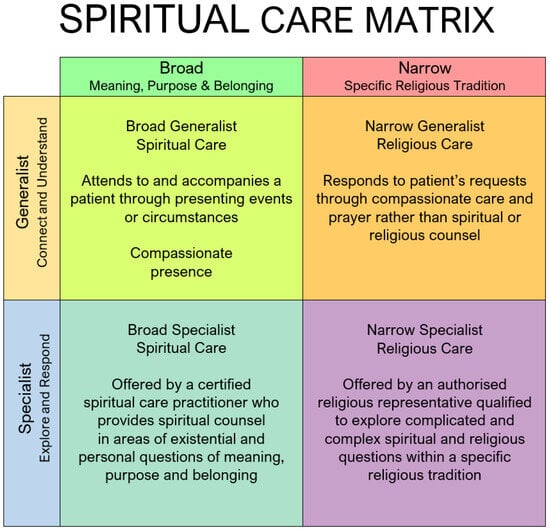 The 2 × 2 Spiritual Care Matrix delineates the relationship between spiritual care and religious care. The two quadrants on the right of the document represent narrower intentional religious care offered by an authorised religious representative of a particular faith or religion to people of similar religious tradition or faith groups. Spiritual care at a more general level is shown in the upper quadrant, and more specialised spiritual care is in the lower quadrant. The left-hand quadrants relate to broad spiritual care; the upper is more general, applying to each member of the multidisciplinary team. As with religious care, there is also a more specialised layer of spiritual care provided by spiritual-care practitioners, represented by the lower quadrant. The lower quadrant works with spiritual distress and existential and personal questions about meaning, purpose, and belonging, with significant skills overlap with the psychosocial disciplines.