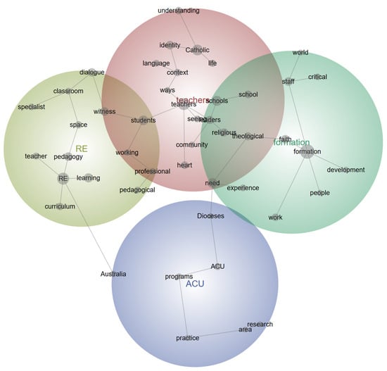 The IPA summarised the domains of interest through the application of a series of integrating principles for each (Table 3), and the Leximancer process confirmed that the themes constituting the principle were validated as representative of the original transcripts and indicative of the significance of the domains. The concept map (Figure 2) indicated that RE (32 hits) focused on aspects of teaching and learning, teachers (24 hits) identified the relationship of teachers to the curriculum, formation (47 hits) represented the complexity and importance of professional learning, and ACU (10 hits) addressed the notion of research as integral to RE development and delivery. Moreover, the concept map illustrated the overlap of the dimensions of interest and pointed to a wholistic set of interventions and practices that would advance RE.