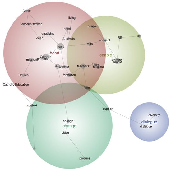 The responses that inspired were centred in the faith foundations for RE. The centrality of Catholic faith within Catholic schools was made abundantly clear with key elements of Formation being centred in Christ, Tradition, Mission, and Faith Journey; Pedagogy situated in terms of discipleship, dialogue, inquiry, and witness; Curriculum as inclusive, founded on encounter and identity, re-contextualised and creative; Research as underpinning awareness and basis for change and accountability; and Partnerships as imperative in enabling a space for the Spirit of God to flourish and be experienced. Responses were also subjected to a Leximancer analysis. Emphasis was granted to themes of the heart (hits, 23), enabling others (hits, 14), dialogue (hits, 6), and change (hits, 4) (See Figure 3). As shown, the essence of RE is centred in a heart perspective which incorporates people and the school community experiencing a changing phenomenon supported by dialogue.