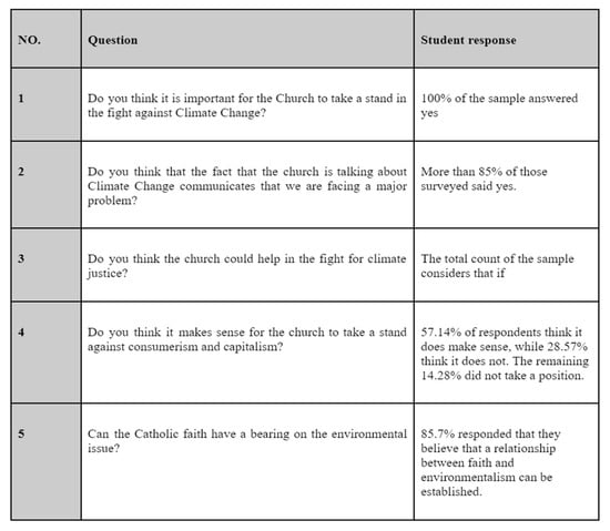 Furthermore, the focus groups offered insight into students’ perceptions of the relationship between Catholicism and the climate crisis. A unanimous consensus was reached on the necessity for the Church to assume an active role in combating climate change, with 100% of participants affirming this requirement. This perception is consistent with the findings of () and (), who emphasised the increasing role of the Catholic Church in promoting environmental justice.