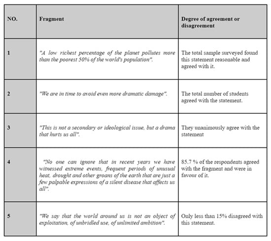 A comparative analysis of selected excerpts from the encyclicals Laudato Si’ and Laudate Deum revealed a high degree of alignment between the opinions expressed by Pope Francis and those of the students. All participants concurred on the necessity of addressing the climate crisis and the disproportionate responsibility of affluent countries for global pollution. These findings align with those of previous studies that emphasise the necessity for prompt and collective action to mitigate the impacts of climate change ().