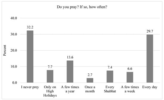 We added another question to examine the religiosity of Israelis: “How often do you pray?” The results that appear in Figure 2 show that 53.6% never or seldom pray, while 46.4% pray at least once a month.