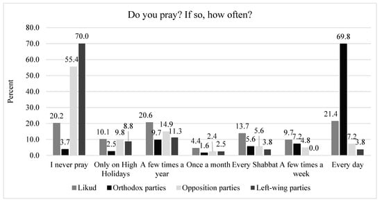 As Figure 3 illustrates, cross-tabulation of prayer and party vote illuminates some interesting trends. As expected, about 70% of those who voted for Orthodox parties (Shas, Yahadut Hatorah, Hatzyonut Hadatit, and Otzma Yehudit) pray every day (Orthodox women do not have to pray daily, but many do). While 70% of those who voted for left-wing parties (Meretz and Haavodah) never pray. A total of 80.1% of those who voted for centrist parties (Hamachane Hamamlachti and Yesh Atid) also seldom or never pray. There is clearly a robust correlation between voting patterns and religiosity among our respondents. The only exception is Likud voters, who are spread among all the categories, with about 51% saying they never or seldom pray and 49% reporting they pray at least once a month.