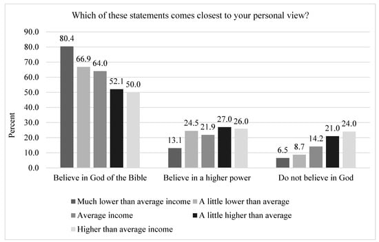 We can conclude that most Israeli Jews believe in the biblical God or a higher power, and these beliefs are influenced by demographic aspects of income (as Figure 4 shows) and, as we discuss later, in terms of age, younger cohorts express higher levels of religiosity than older Israelis.