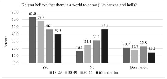 In the survey, when we cross-tabbed many questions, we saw distinctive views among different age groups. As Figure 5 illustrates, the youngest cohort (18–29-year-old respondents) exhibited the highest levels of agreement with the belief in the afterlife, while the oldest respondents exhibited the least support. An example is in the responses about beliefs regarding the “world to come (like heaven and hell)”.