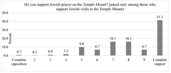 Those who agreed with Jews visiting the Temple Mount (460 respondents out of 1204) were asked a follow-up question: “Do you support Jewish prayer on the Temple Mount?”. In the recent decade, the question of Jewish prayers on the site has been a “hot topic” since many religious–Zionist rabbinical authorities have softened their opposition to this ritual (). As Figure 8 below shows, almost all who agree with allowing Jews to visit the Mount also agree with Jewish prayer on the Mount—almost 87% agree. Thus, we can assume that, for many Israelis, visiting the Mount is understood as with the intention of praying on it. While visiting the site is part of the Status Quo agreements, Jewish prayer is not.