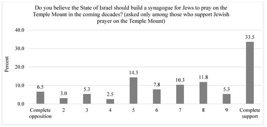 In the survey, we asked two questions to examine the support for ideas that the State of Israel should initiate the construction of a Jewish structure on the Mount—whether a synagogue or a Temple. We found that 10–20% of the sample supported such ideas, with the most significant support coming toward the idea of a synagogue on the site.
