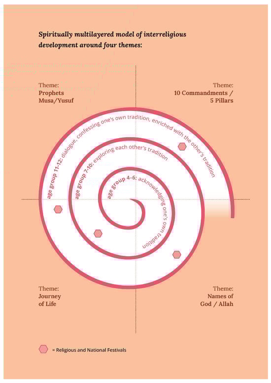 Characteristic for this model is the choice the principal and the teachers made for a restricted number of overarching themes, with age-related topics in the classroom which were developed at three levels (young children, middle group and oldest students) in line with their psychological and religious development (Figure 1). Following this educational model, every week started with a joint weekly opening. All the children gathered in the school hall for this. The principal—or one of the teachers—told a story, and a song would be sung, or a poem would be read, as an introduction to the topic of the week, part of a larger theme. Then, in the separate Christian and Islamic RE classes, divided by age groups, this theme was discussed and further developed from the Christian or Islamic tradition, respectively. The elaboration of the theme in topics was adjusted to the psychological–religious development of the respective age groups.