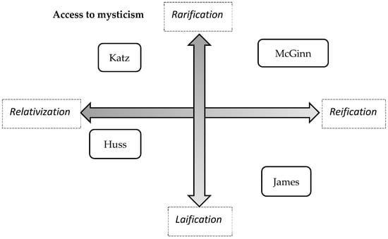 This graphic is intentionally simplified to convey the basic idea of two converging axes (essence of and access to mysticism), and we illustrate the space between the extreme markers with some, representative thinkers. We suggest that this figure conceptualizes the way people have thought about or studied mysticism in the 20th century. It is not that scholars set out necessarily to strategically or intentionally defend or attack a position on these axes, or that this is all they are concerned with, but rather that these are simply the categories of thought along which mysticism is discussed. Consider, for example, the study of psychedelics in relation to mysticism. That topic fits into how people have approached the study of mysticism in general. Those regarding mysticism as rarified have concentrated on the use of psychedelics by shamans and only under controlled conditions or to a lower extent by lay people or whole communities. Then, their view of mysticism also tends to relativization, specific to that circumstance, that religious tradition, that time period, etc. On the other hand, those regarding mysticism as a more laified concept, tend to study psychedelics as engendering mystical experience among (potentially) any one and then develop measures to assess that. Their view of mysticism concomitantly tends to be more reified, toward a common core that all people can be seen to experience.