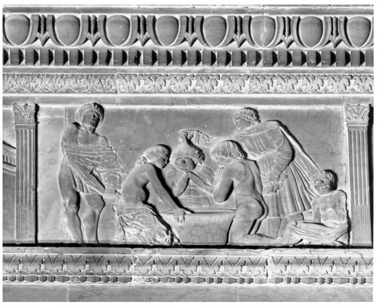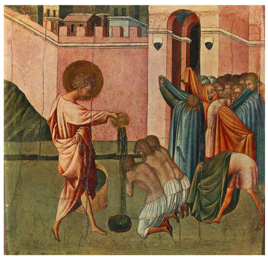 The initial hesitancy to identify Ansanus as the first baptizer may be explained by the integral role of the bishop in the dispensation of the sacrament. Depicting a lay saint as dispensing baptism was not unorthodox or unprecedented, but it was uncommon. The medieval church permitted lay-administered baptisms only in cases of necessity (e.g., imminent death).47 Presiding over baptisms was the responsibility of bishops throughout late antiquity and, in communal Italy, for most of the Middle Ages, although baptisms could be delegated to clerical representatives out of practical necessity (Thompson 2005, p. 313). At Siena and other cities, the bishop oversaw the baptism of most of the infants in the city during the Easter vigil and Pentecost.48 This sacrament initiated the recipient not only into the body of Christ but also into citizenship in the commune (Thompson 2005, p. 311).