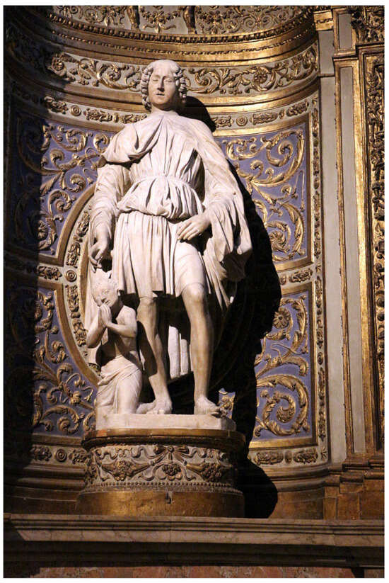 Saint Ansano. Giovanni di Stefano, c. 1487. Marble sculpture. Location: Chapel of Saint John the Baptist, Cathedral of Santa Maria Assunta, Siena. Photographer: Sailko https://commons.wikimedia.org/wiki/File:Giovanni_di_Stefano,_sant%27ansano_(1482-1487_circa).JPG accessed on 25 November 2024. Copyright: CC BY 3.0 (https://creativecommons.org/licenses/by/3.0/deed.en).