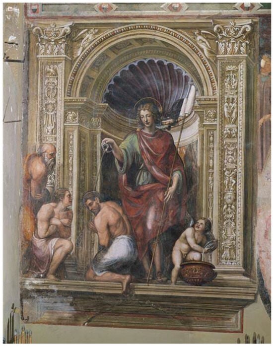 The final extant republican-era image that also shows Ansanus simultaneously baptizing and holding the communal standard is a fresco painted by Giovanni Antonio Bazzi (“Il Sodoma”) on the west wall of the Sala del Mappamondo (or Sala del Consiglio) in the Palazzo Pubblico between 1529 and 1530 as part of a government commission (Figure 5).105 This is the only appearance of the scene in a secular building that would have been seen mainly by a more exclusive audience of government officials. It was part of a larger project by the Sienese government to promote “an image of republican unity and self-sufficiency” in the aftermath of the city’s victory over the papal and Florentine armies at the battle of Camollia in 1526, for which Ansanus served as “the embodiment of Siena’s claim to be a republic founded on Christian precepts” (Norman 2003, p. 282). In light of the textual development of the saint’s significance for the identity of the city as civitas discussed above, this assessment by Norman can be sharpened further: the baptismal event was chosen (as opposed to the more common depiction of Ansanus simply holding the communal standard and palm) to establish a continuity from the exact moment of Siena’s civic rebirth through the Christianizing sacrament up to the contemporary republican government that still met in that very room. Given how long it took for his dispensation of baptism to be fully articulated in other sources, depicting the baptismal event in the seat of government would not have been the preferred iconography a century earlier. A comparison with Simone Martini’s Maestà showcasing Siena’s patron saints, located on the opposite east wall of the Sala, highlights how much the depiction of Ansanus had developed in the intervening two centuries. Though his rendering as part of a group of supplicants to the Madonna on behalf of the city in the early Trecento had not been abandoned in the Cinquecento, there was now a desire to better call to mind to viewers—in this case the members of the Consiglio Generale—his active role in shaping the history of that same city.