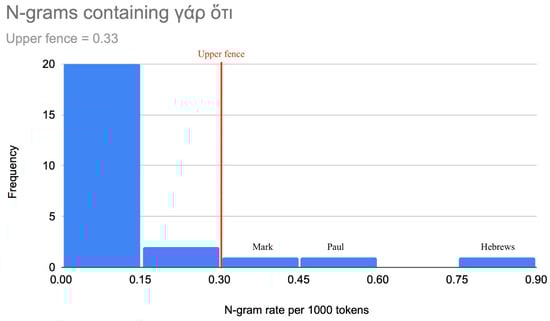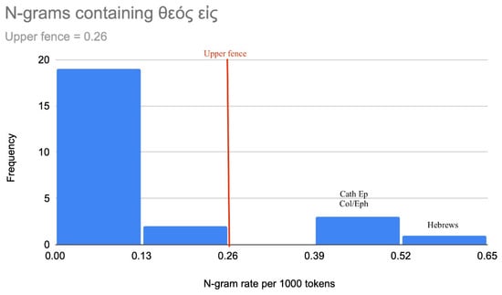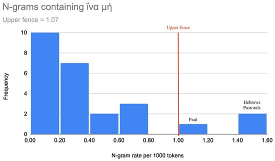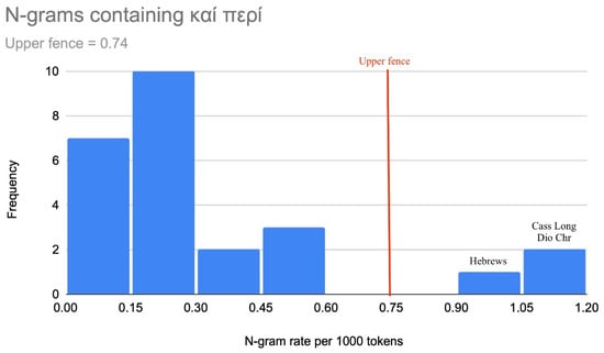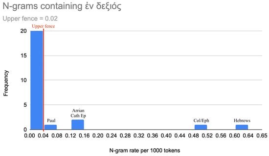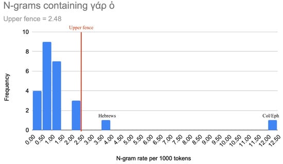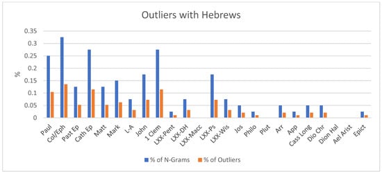 - N-Grams that result from direct quotations of biblical texts: For example, Hebrews and the Psalms are outliers in terms of the high frequencies at which σήμερον ἐάν, μή σκληρύνω, and τάξις Mελχισέδεκ occur, undoubtedly because these sequences occur in passages the author quotes often and discusses at length. Although direct quotations are certainly a matter of influence, this type of intertextuality is already discussed repeatedly in the commentaries and is hardly the sort of subtle influence that requires digital methods to detect.