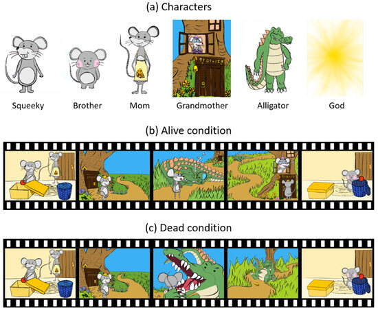 Children were tested individually either in the developmental psychology lab at Ewha Womans University or in their home. Prior to the FB task, the experimenter introduced children to five personified animal characters that would appear in the FB story (Squeeky, his younger sibling, mom, grandmother, and an alligator) and God, each depicted on a laminated card (Figure 1a). The following information about them was verbally given to them (all verbal materials were given in Korean): (a) the mouse named Squeeky likes to play with a ball; (b) Squeeky has a mischievous younger sibling; (c) an alligator lives near Squeeky’s house, whose favorite food is mice; (d) Squeeky’s grandmother lives near his town; and (e) God is invisible but seeing us. For the pictorial depiction of God, we used rays of light (i.e., “God rays”), which is known as a typical, non-anthropomorphic symbol of God or the Holy Spirit.