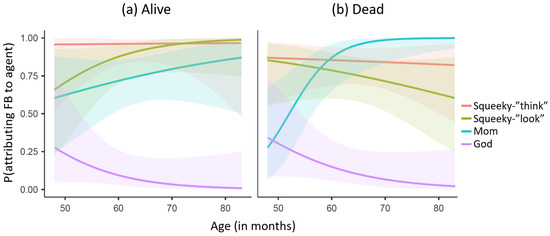 Concerning the alive–dead difference, additional simple effect analyses for each agent showed a nonsignificant trend of higher FB attribution in the dead compared to the alive condition for Squeeky-think (β = −1.53, z = −1.78, p = 0.075) and Squeeky-look (β = −1.34, z = −1.78, p = 0.075). For mom, there was an opposite but also nonsignificant trend of lower FB attribution in the dead compared to the alive condition (β = 1.92, z = 1.88, p = 0.060), and for God, there was no significant difference (β = 0.63, z = 0.69, p = 0.492).