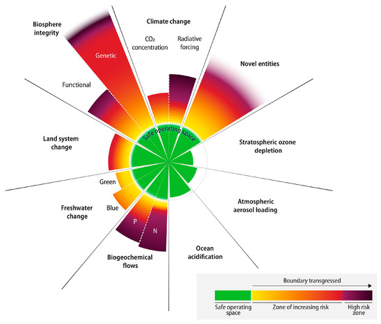 - Richardson, Katherine, Will Steffen, Wolfgang Lucht, Jørgen Bendtsen, Sarah E. Cornell, Jonathan F. Donges, Markus Drüke, Ingo Fetzer, Govindasamy Bala, Werner von Bloh, and et al. 2023. Earth beyond six of nine planetary boundaries. Science Advances 9: 2458. [Google Scholar] [CrossRef]
