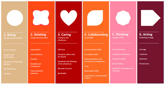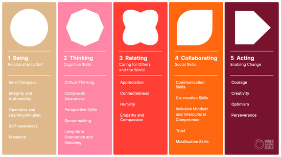 The category Being refers to the relationship to self: “Cultivating our inner life and developing and deepening our thoughts, feelings, and body help us be present, intentional and non-reactive when we face complexity” (Jordan et al. 2021, p. 13). This category refers to five inner values, skills, and qualities: Inner Compass, Integrity and Authenticity, Openness and Learning Mindset, Self-awareness, and Presence. Inner Compass means that people develop a deeply felt sense of responsibility and commitment to values and purposes relating to the good of the whole. Integrity and Authenticity refer to the commitment and ability to act with sincerity, honesty, and integrity. The quality of Openness and Learning Mindset highlights the importance of having a mindset of curiosity and a willingness to be vulnerable and embrace change and grow. Self-awareness refers to the ability to be in reflective contact with one’s own thoughts, feelings, and desires, having a realistic self-image, and the ability to regulate oneself. Presence makes reference to the ability to be in the now and here without judgment and in a state of open-ended presence (Jordan et al. 2021, pp. 13–15; Manguera et al. 2022).
