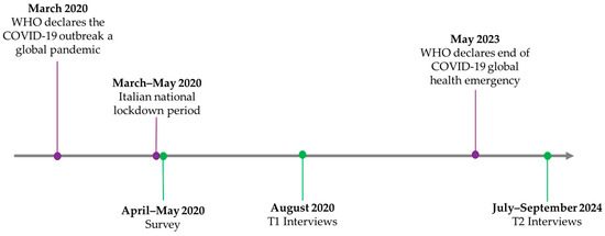 This paper builds on an online quantitative survey conducted in the first months of the global pandemic involving 164 parish priests and parish council presidents in the Catholic diocese of Bolzano-Bressanone (Isetti et al. 2021a). The survey aimed to investigate how pastoral care was delivered and changed through the use of ICT in religious activities during the COVID-19 outbreak. At the end of the survey, participants had the option to leave their contact details for follow-up qualitative telephone interviews. This second step of the research project was conducted to provide greater depth to the quantitative data and monitor developments in the months and years following the most acute phase of the pandemic. Specifically, semi-structured interviews were conducted in 2020 (T1) and again in 2024 (T2), with parish priests and laypeople officially representing the faithful (parish council presidents) from the Diocese of Bolzano-Bressanone in South Tyrol (Italy), for a total of 20 interviews. This two-wave follow-up study aimed to investigate the immediate impact and enduring legacy of the COVID-19 pandemic on the pastoral (digital) activities of both parish priests and council presidents. Figure 1 illustrates the research timeline alongside pandemic milestones, marking key stages in data collection (green) in relation to the pandemic’s onset, lockdown periods, and its official end (violet).
