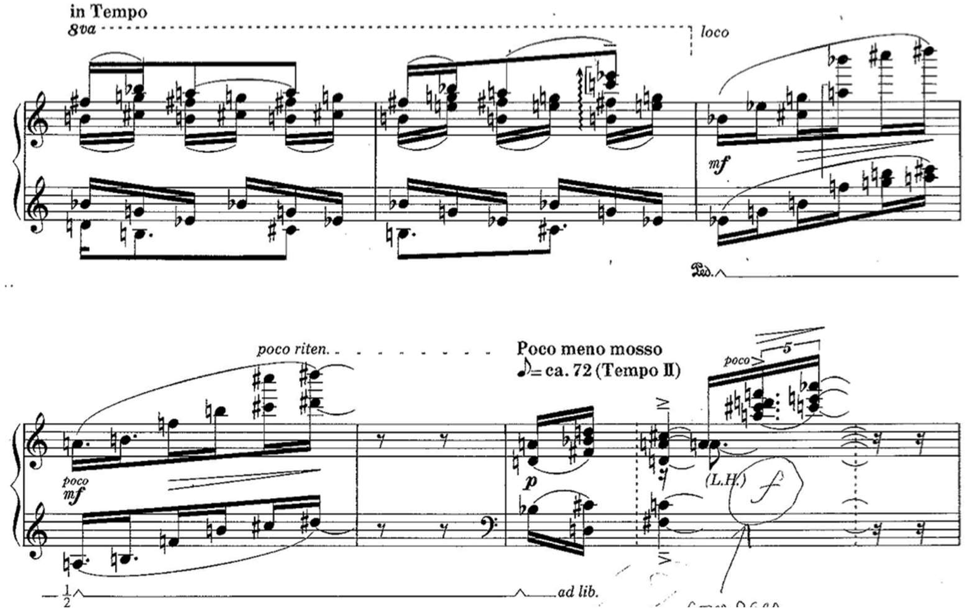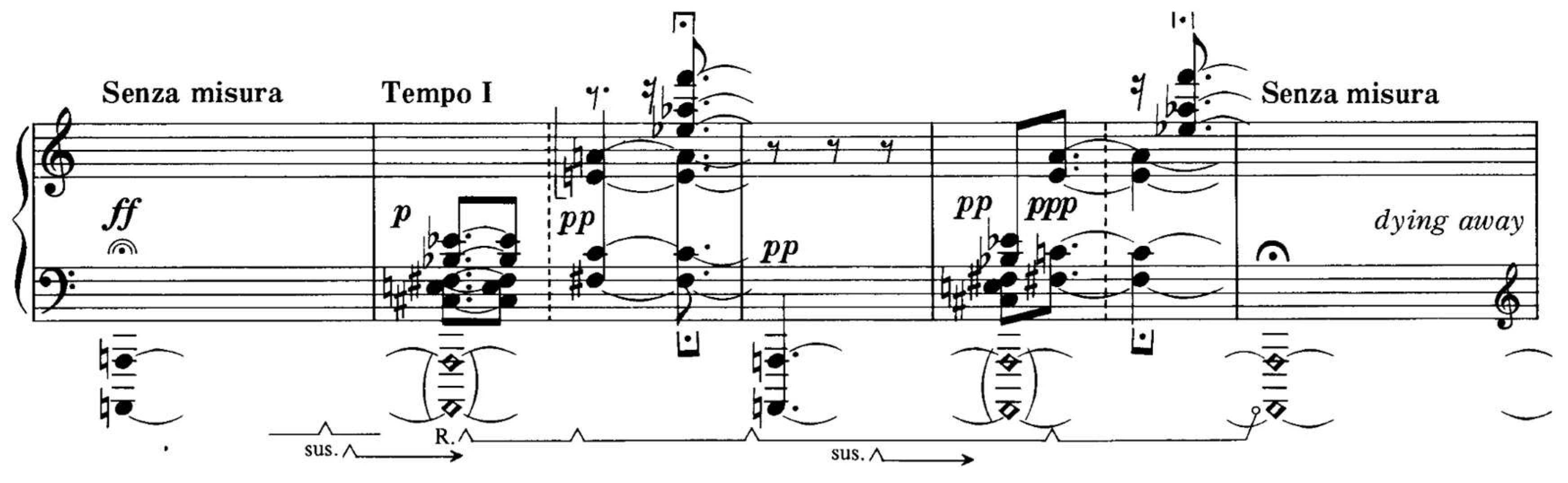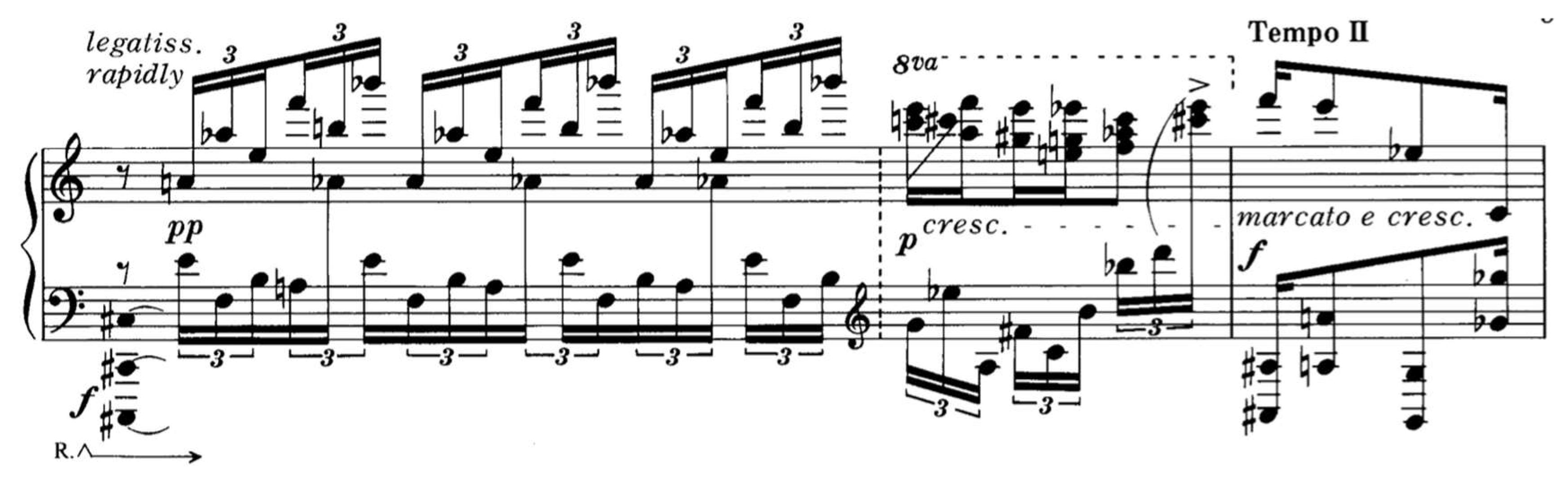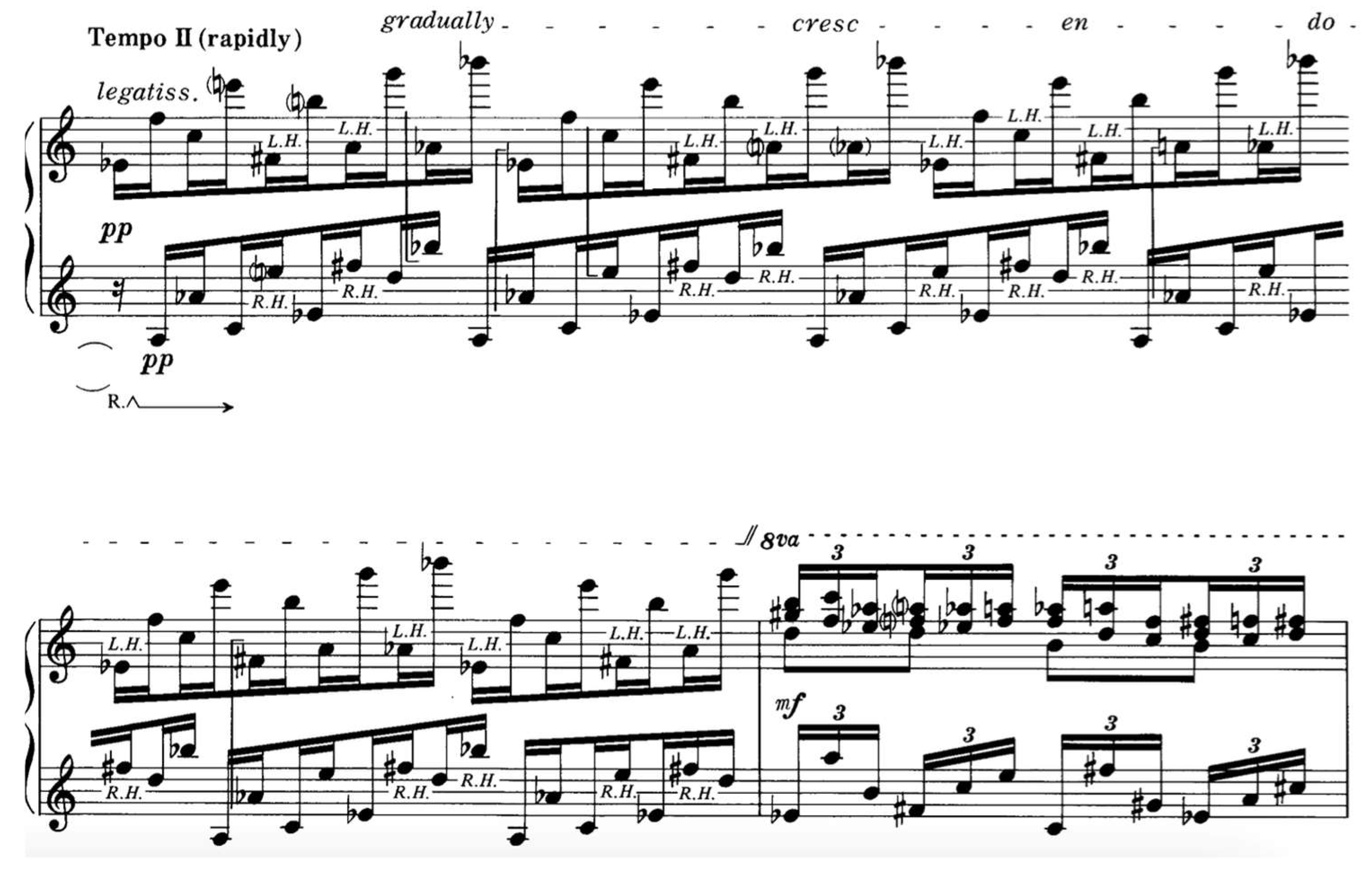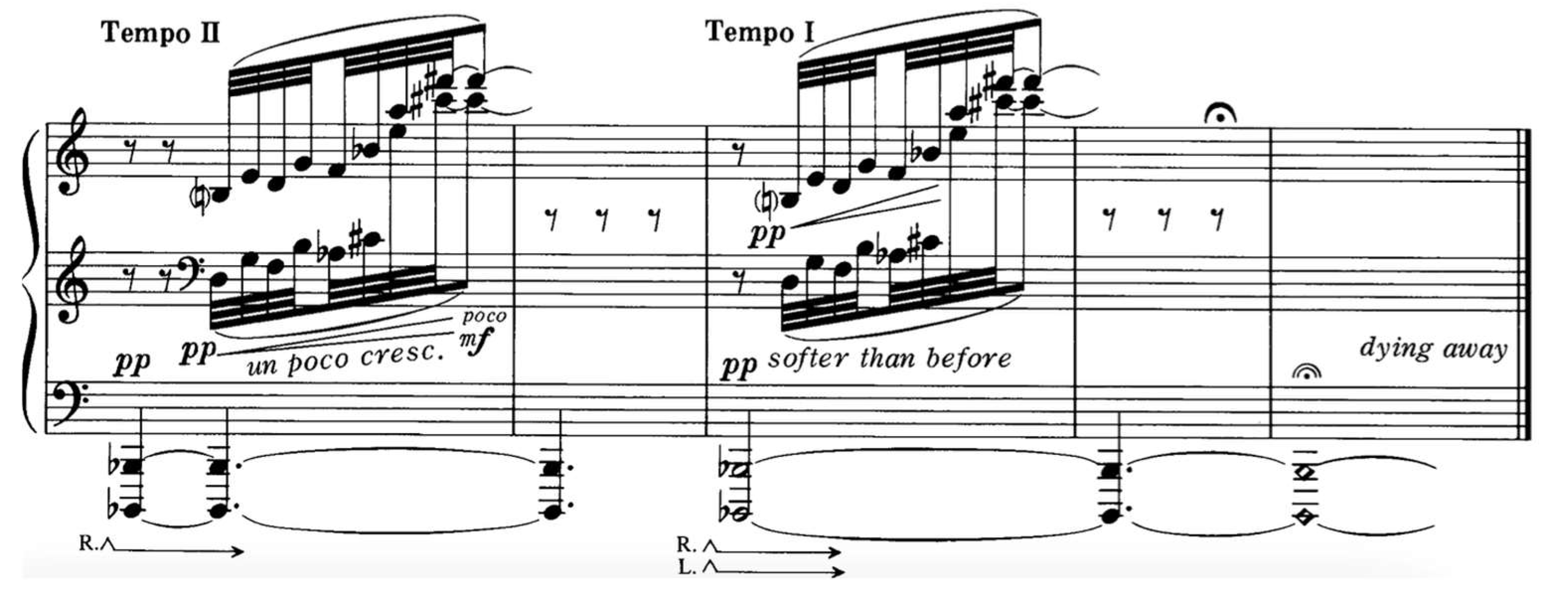 Figure 5) to “leggerissimo rapidly” while instructing players to keep sustain pedal pressed until the phrase ends thus producing a controlled yet natural sound.