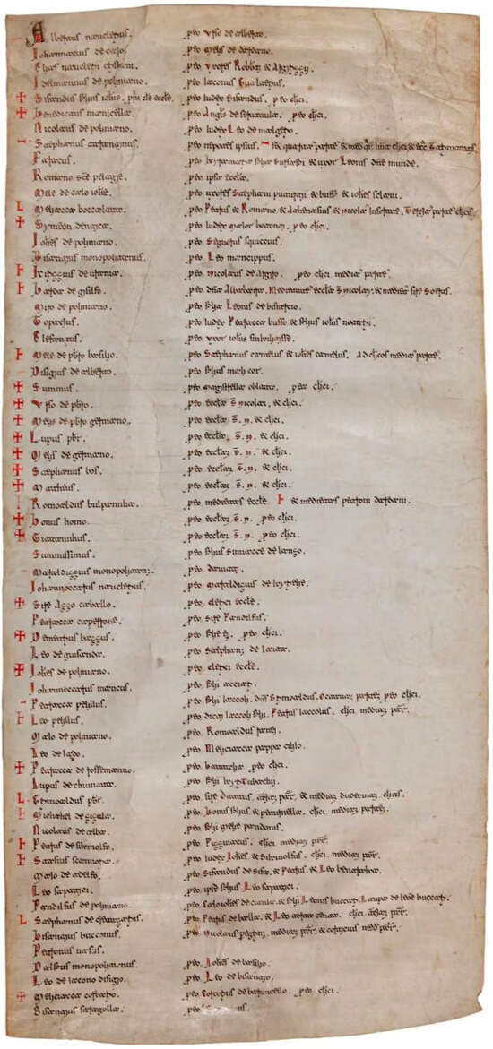 A distinct concentration of activity surrounding sailors and their musical practices emerges along the southeastern coast of Italy, largely due to the efforts of two Apulian scholars well-known for their investment in the folk culture of the region: Saverio La Sorsa (ca. 1877–1970) and Alfredo Giovine (1907–1995).30 Importantly for St. Nicholas’s cult, Bari is the location of his primary relics thanks to Norman-Barese sailors in 1087 who transported his bones from East to West and further solidified his cult in Europe (Nitti di Vito 1902a; Jones 1978, pp. 172–202; Corsi 1987; Chibnall 1979; Bellomo 2009). So integral are the sailors to St. Nicholas’s cult in and around Bari that their names are recorded in a document currently on display at the Museo Nicolaiano next to the Basilica di San Nicola (see Figure 3).31