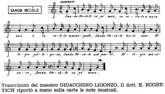 | Allègre, marenare, Sanda Necole va pe mmare, Allègre, pellegrine, Sanda Necole av’a menì. Sanda Necole meracheluse, Japre la porte a ci le tène achiuse, E li japre a la vergenèlle, Sanda Necole iè tanda bbèlle. Sanda Necole va pe mmare, Va vestute da marenare, Gesù Criste a lu temone, Tutte l’àngeue ‘m brecessione. Alle vinde d’abbrile Sanda Necole partì da Mire, Allègre, marenare, Sanda Necole mo’ vène pe mmare. (La Sorsa 1934, p. 193) | Quickly, sailors, St. Nicholas sails the sea, quickly, pilgrims, St. Nicholas will come. St. Nicholas, miraculous, Opens the doors that are closed, And opens them to the little Virgin, St. Nicholas, so beautiful. St. Nicholas goes to sea, Dressed as a sailor, Jesus Christ at the helm, All the angels in procession. On the 20th of April, St. Nicholas departed from Myra, quickly, sailors, St. Nicholas now comes by sea. |