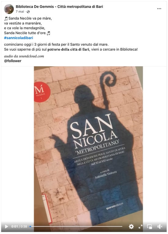 Facebook Post from the Biblioteca De Gemmis—Città metropolitana di Bari, 7 May 2025, featuring children singing Sanda Necòle va pe màre (https://fb.watch/AiIW_r1zRp/, accessed 18 June 2025).