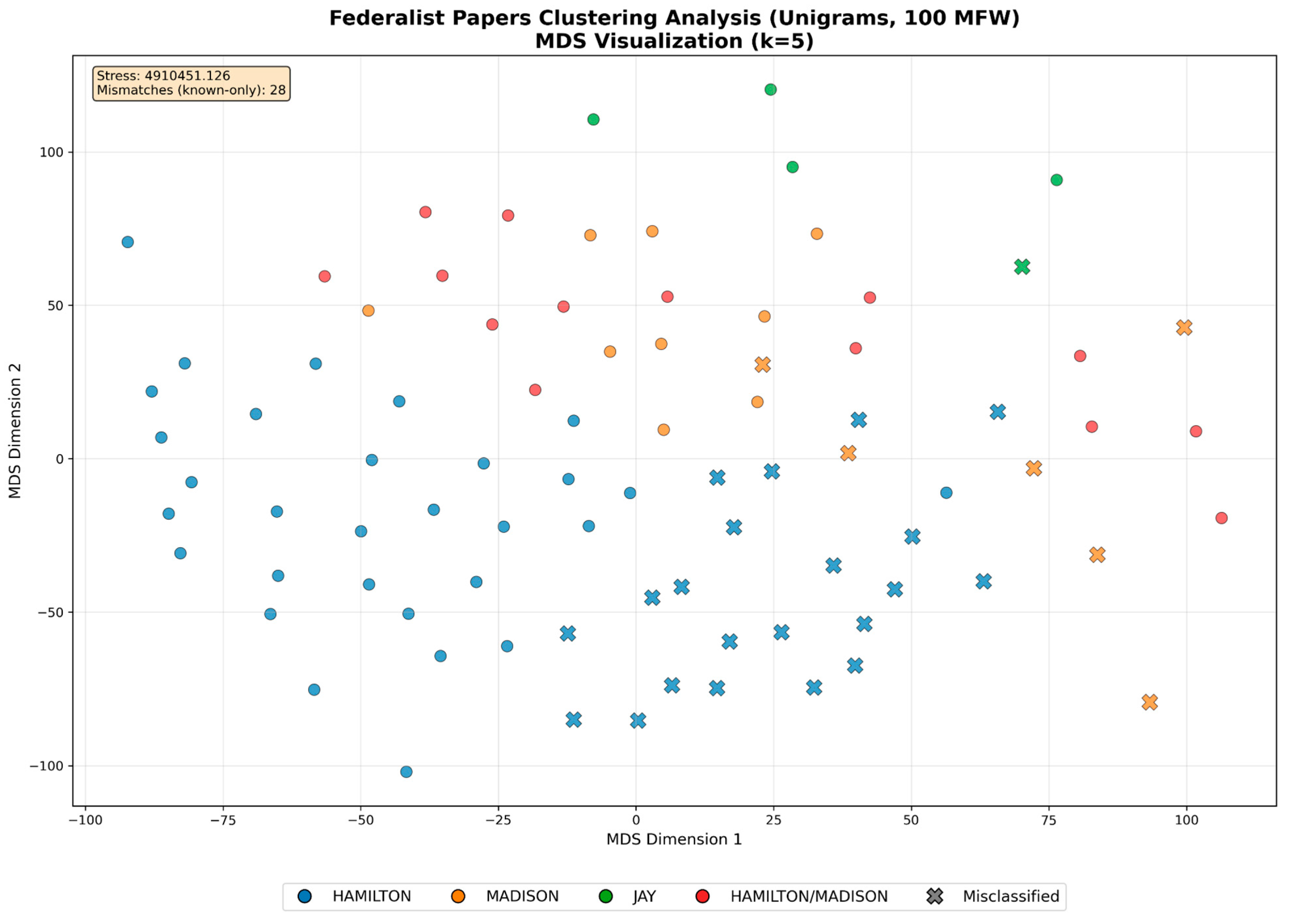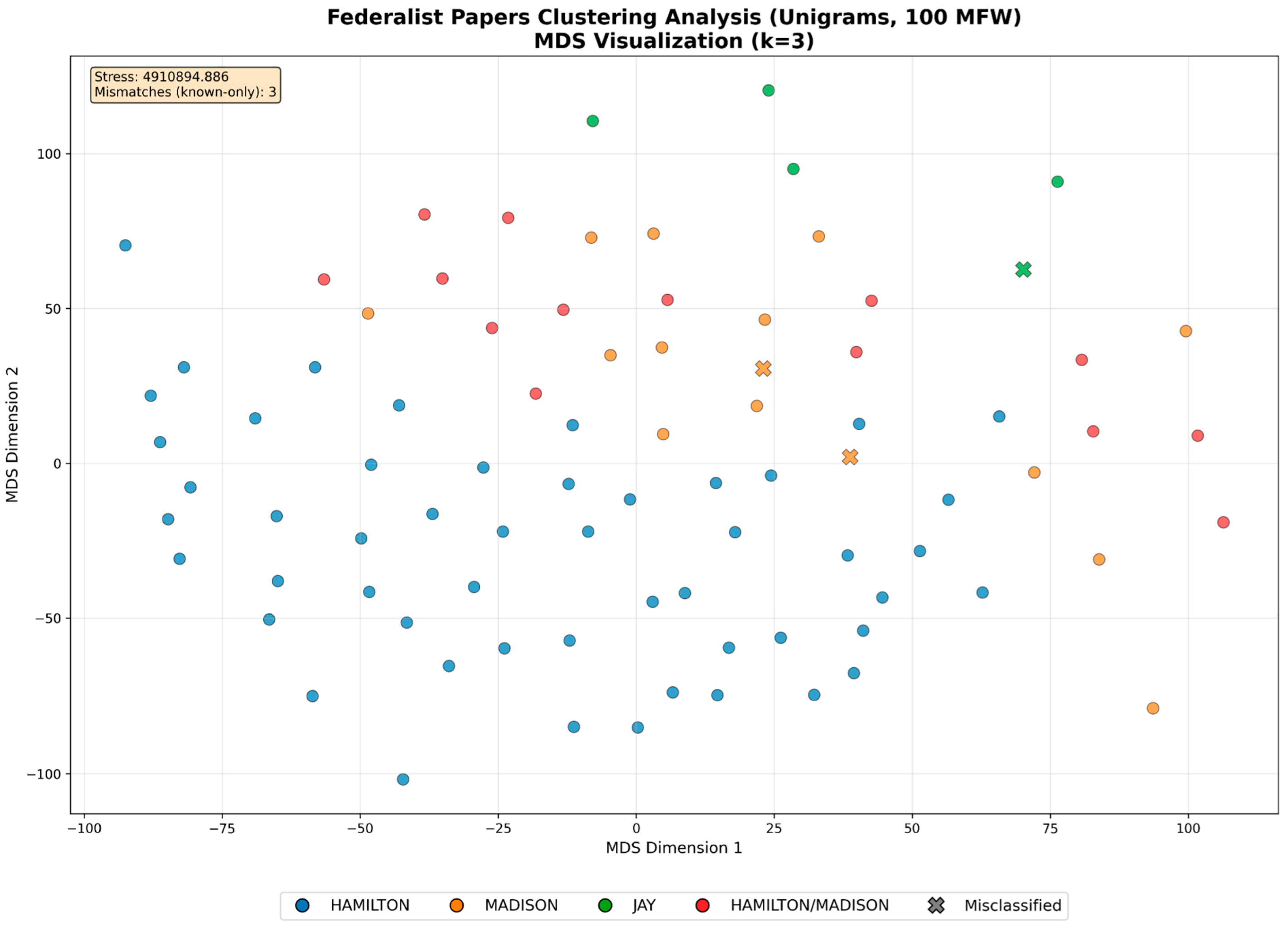 Figure 2. Federalist Papers Clustering Analysis (Unigrams, 100 MFW).