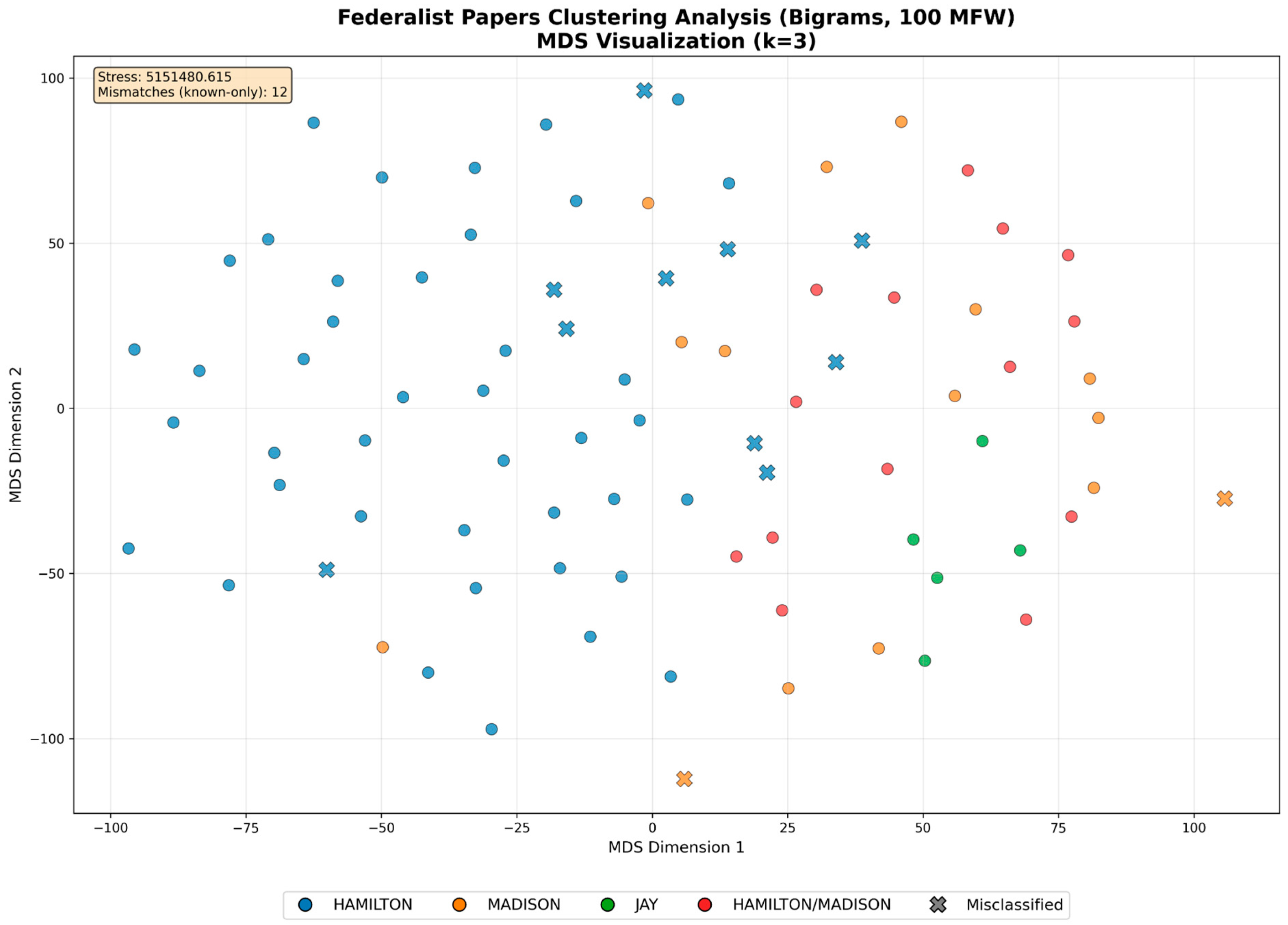 Figure 3. Federalist Papers Clustering Analysis (Bigrams, 100 MFW).