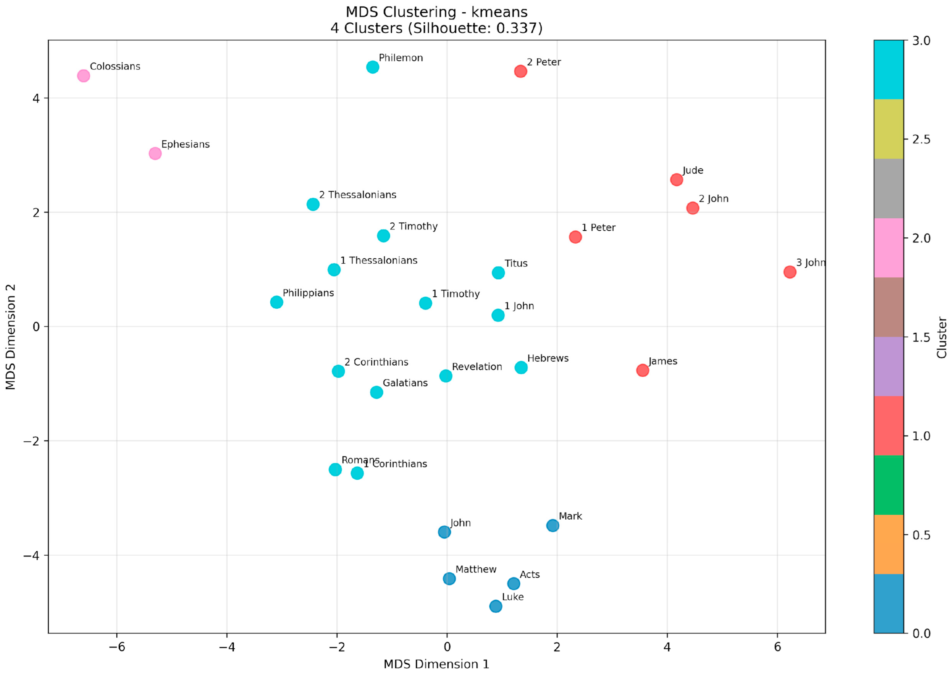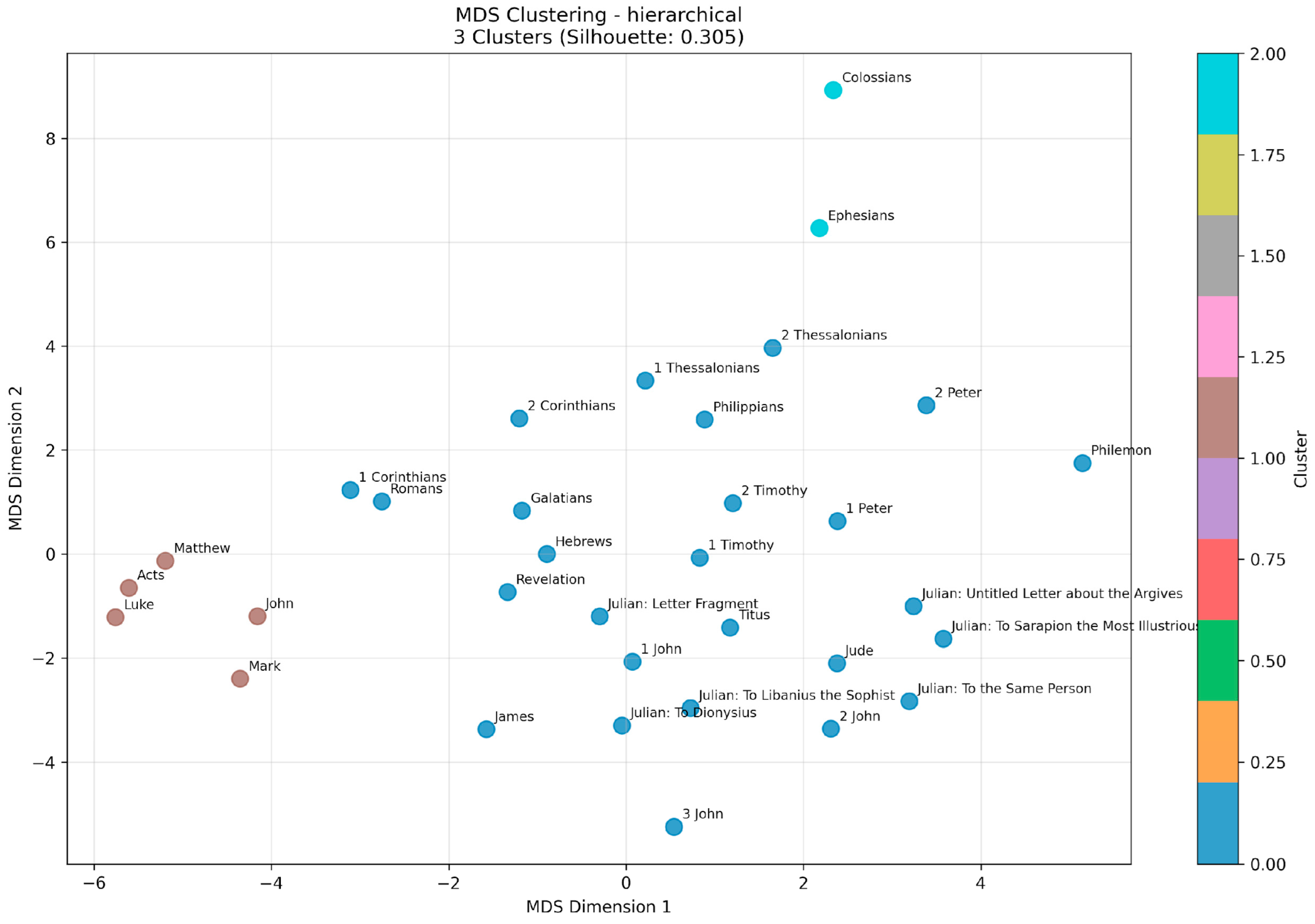 The study results were broadly similar when Julian’s letters were removed from the analysis. In this analysis, four clusters emerged with the K-means clustering algorithm selected. Dimensionality was reduced to eight after PCA, preserving 96.2% of the original variance. Cluster 0 comprises the gospels and Acts, Cluster 1 comprises the non-Pauline letters except for 1 John, Cluster 2 comprises Ephesians and Colossians, and Cluster 3 again comprises all but two of Paul’s supposed letters and 1 John (Figure 7).