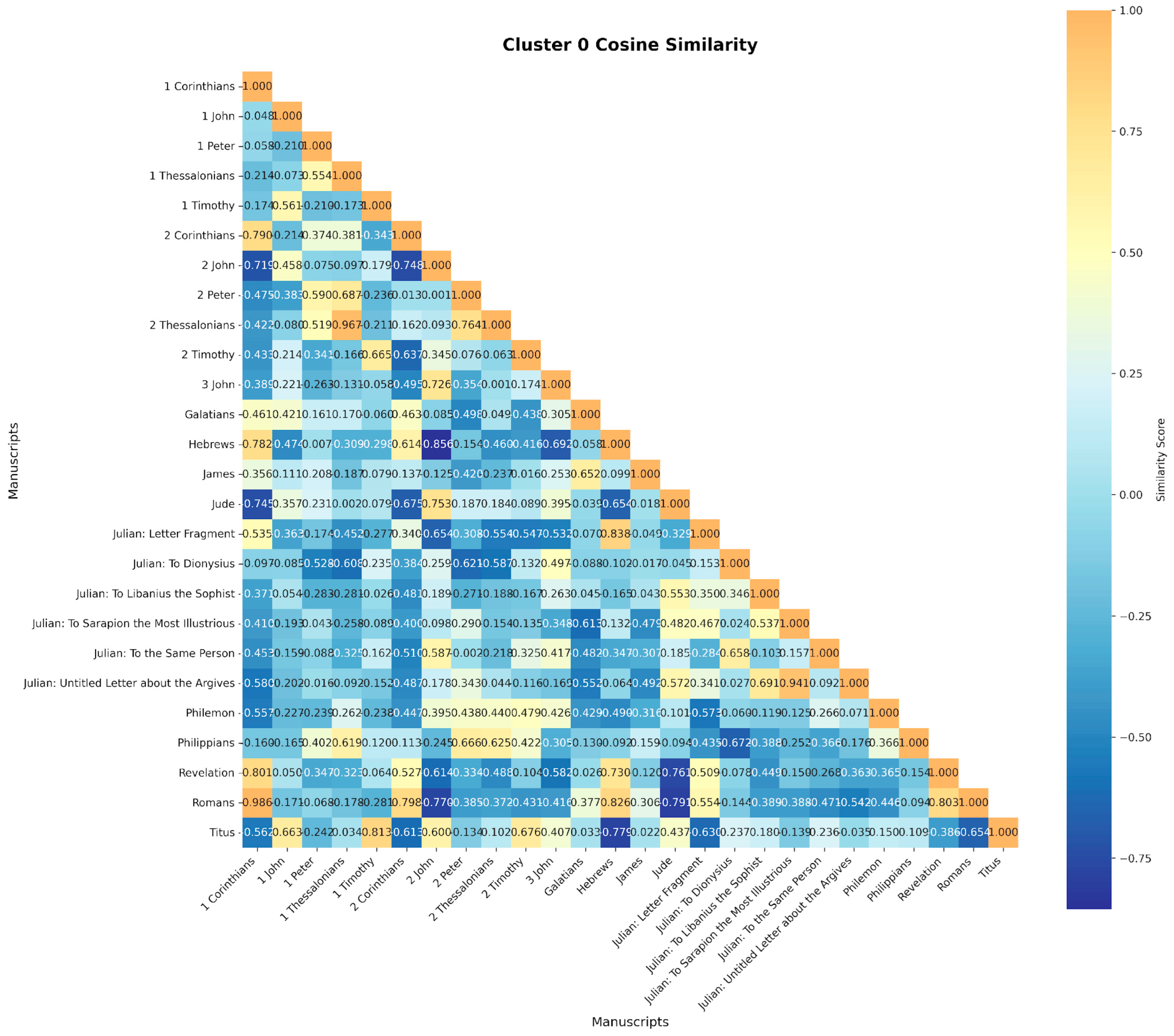 Of all the relations, Romans and 1 Corinthians achieve the highest similarity score of 0.986. While exceedingly high, this finding is broadly commensurate with other cosine similarity research, as Roy and Robertson find a similarity score between these letters of 0.941 (Roy and Robertson 2022, p. 99). However, this study departs from Roy and Robertson in a series of methodological choices, such as implementing variance filtering, robust scaling, PCA, and applying cluster mapping, and many results differ, such as this study’s significantly higher similarity score for 1–2 Thessalonians (Roy and Robertson 2022, pp. 113–14).