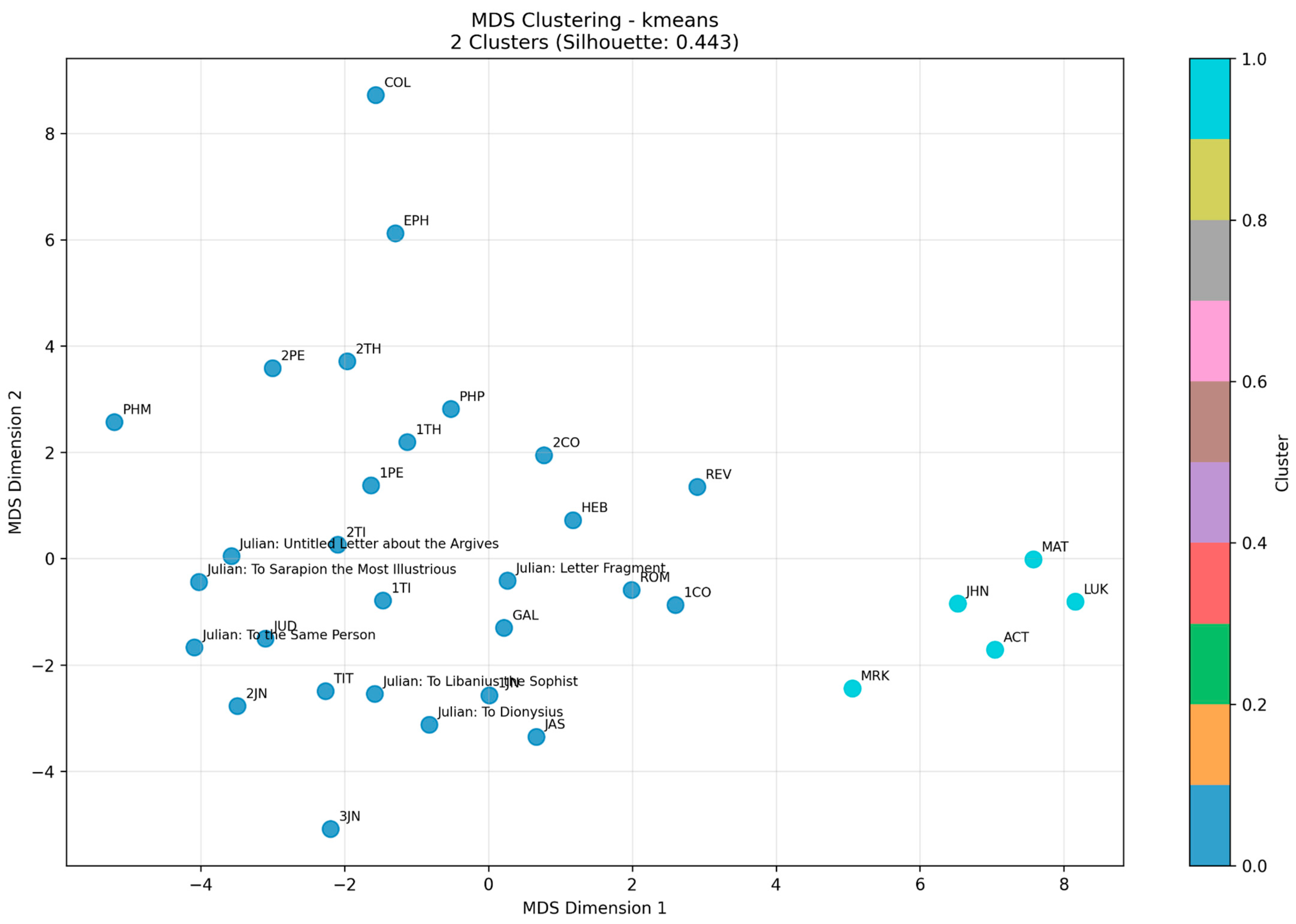 To demonstrate the variability of quantitative study results from design choices, another test was run with a custom noun_chunks function using the same clustering range (2–33). In this trial, two clusters emerged between the letters and the gospels with a K-means clustering selection and silhouette score of 0.443 (Figure 8).