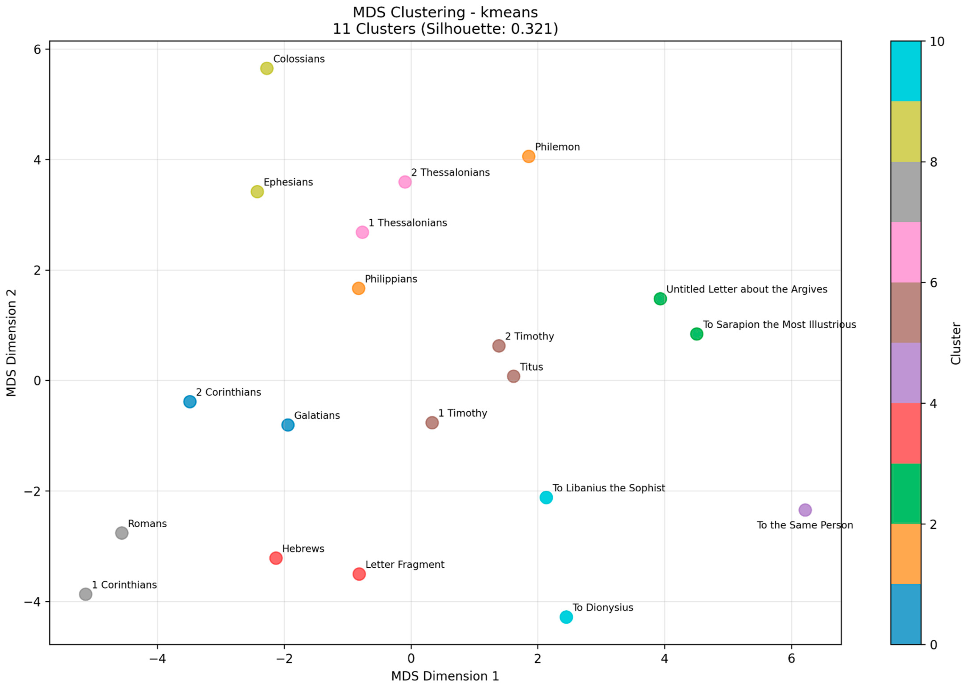 Finally, when the non-Pauline New Testament corpus was removed to isolate the Julian and Pauline texts, 11 clusters emerged with a K-means clustering selection and silhouette score of 0.321. Only one cluster, Cluster 3, is a mix between a Pauline and Julian text. However, half of Julian’s clusters are closest to a Pauline cluster: Julian Clusters 2 and 10 are closest to Pauline Cluster 5, which is composed of the Pastoral Epistles (Figure 9).