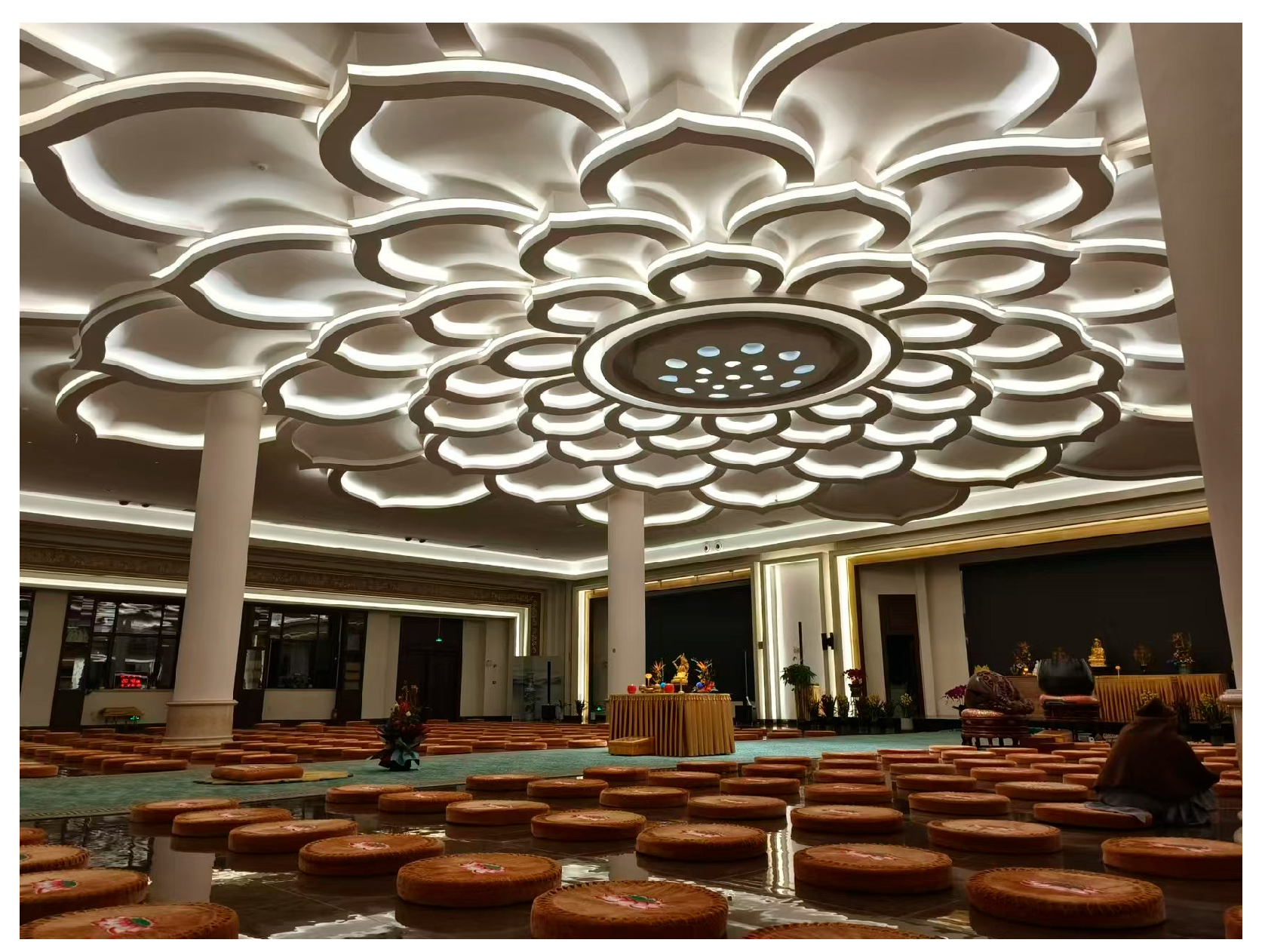 Wooden fish and inverted bells are placed beside the platform. The classroom is divided into southern and northern sections along the central axis, with about 225 cushions in each section, totaling approximately 450 spots. Each cushion features lotus embroidery. A nun is specifically assigned to arrange the cushions, ensuring that the edges of the round cushions maintain a tangent relationship with the gaps in the floor tiles, resulting in a very orderly appearance overall. The arrangement of the venue symbolically recreates the scene of the Pure Land as described in the Sūtras.