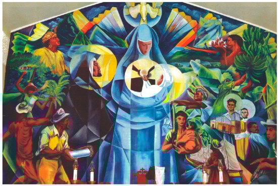 These incendiary words were poignant for the time, and very necessary for occasioning a seismic shift in theological thought away from colonial categories and interpretations. Hamid further added that “the task of theology would be to point out ways in which [Caribbean] creativity and cultural heritage could become a vehicle to receive and express faith. For this is where [humanity] really is and God meets [them]” (). St. Omer would take up this challenge with his artwork, using religious iconography to express a faith that resisted colonial categories and countered narratives of racial and cultural inferiority. In doing this, his work contributed to a broader tradition of subversive Black Catholic expression in the Caribbean and wider Black Atlantic region. (For further examples see (), (), and ()).