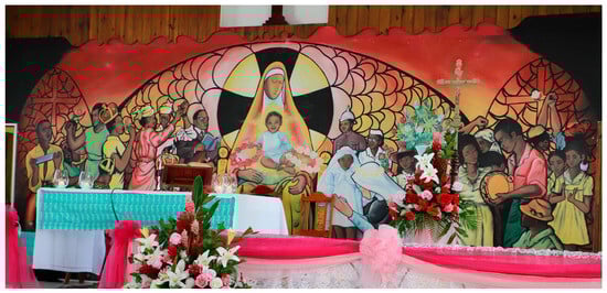 The second mural for consideration (Figure 2) is from the Roman Catholic parish of St. Rose of Lima in the village of Monchy. It features a popular cultural festival on the island, whose symbol is the rose flower.