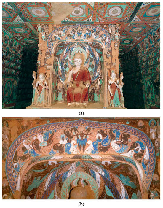 Figure 3e). This abstract ring-shaped lotus has already appeared in the Mogao Grottoes during the first phase (421–439) of the Northern Dynasty (e.g., Cave 268, as illustrated in