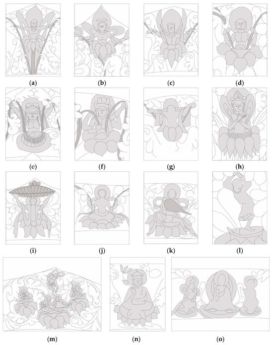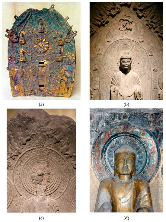 Figure 7d). Here, the central buddha within the double-scroll pattern forms part of a grouping of seven buddhas. All seven figures are relocated to the outer rim of the halo and integrated into the vines. While inheriting Qingzhou’s tradition, this configuration introduces a distinct stylistic departure.